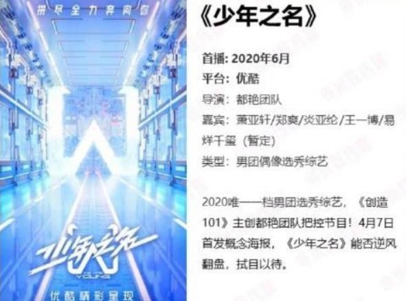 《青春有你2》和《创造营2020》相继官宣,《以团之名》改名为《少年之名》,并发布海报。
