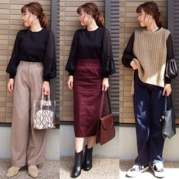一件黑色内搭不仅显瘦搭配上也不容易出错,会是很多人的选择,博主这件黑色毛衣虽然看上去有些宽松,但衣身和袖口处比较贴合身体,可以让细腰和纤细的手腕得以展现,就能恰到好处地凸显女性优雅的一面。因为内搭和裙装都是低调的中性色,所以搭配各种彩色外套也不会太花哨。