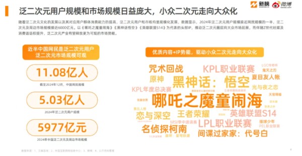 报告显示,2024年,我国泛二次元用户规模达5.03亿人,接近网民规模的一半,泛二次元及周边市场规模达5977亿元。以《哪吒之魔童闹海》《黑神话:悟空》、英雄联盟S14为代表的头部IP推动了泛二次元圈层向大众市场延展,而伴随Z世代社媒及消费话语权提升,泛二次元产业有望释放更为可观的市场势能。