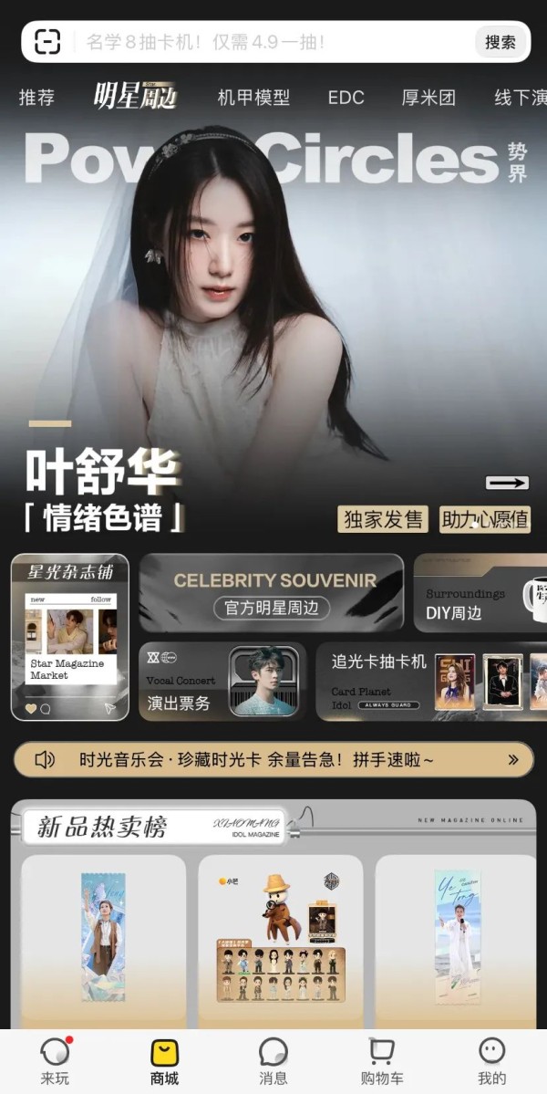 明星周边页囊括了多个周边分类,包括星光杂志铺、官方明星周边、演出票务、DIY周边、追光卡抽卡机。4月23日这天的Banner菜单,展示着快发3小卡、浪姐小卡、女子推理社小卡、雅的单人抽卡机以及独家发售的叶舒华杂志套装。
