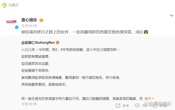 对于吴慷仁的粉丝而言,这一消息无疑是一颗甜蜜的糖果,让他们对偶像的未来充满了无限的期待和憧憬。他们相信,在壹心娱乐的精心打造下,吴慷仁的演艺事业定能再攀高峰,成为华语影视圈一颗璀璨的明星。而对于整个华语影视圈而言,吴慷仁的加入无疑是一股新鲜血液的注入,将为行业的发展注入新的活力和灵感。