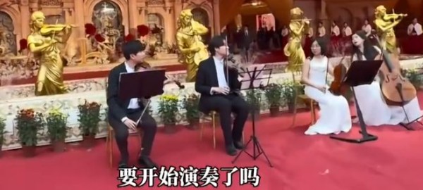 而且还特意找来了广东省剧院团的乐团,从宾客入门,就能听到优美的音乐,但不用说,能请到省级单位的乐团,这个花费必然不会少,在乐坛的背后,还摆了几个镀金的小人,搭了一个临时的喷泉,所有的场景,可以说都是用钱堆起来的。