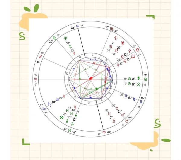 梁朝伟的星盘配置相当独特,融合了固定星座大十字、水象大三角、信封和风筝格局等多种元素。这种复杂的配置使得他在性格上表现出坚毅、专注和稳定的特点,同时在情感上又极其敏锐和富有表达力。