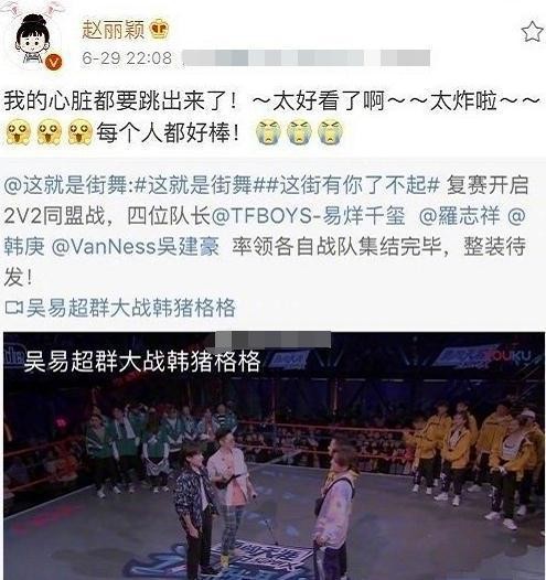 其实从赵丽颖发的这一条微博当中并没有看出来她到底是支持哪一队的,所以就应该是真正的去支持节目中的一些选手。没有说因为这是个明星主持的综艺节目,所以就喧宾夺主去为一些明星加油,反而是直接晒出这就是街舞的标识,也暗示着好像是她是在给所有人打cue了吧。