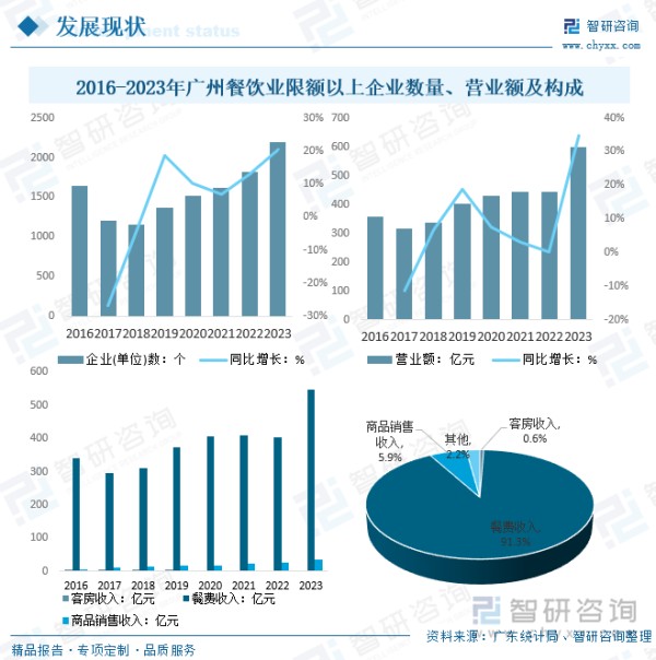 餐饮业是一个国家和地区国民经济的重要组成部分,也是旅游业的支柱产,它主要为经济发展和人民生活提供社会服务和保障,广州作为“中国美食之都”和“国际美食之都”,餐饮业发展更为迅速,据广东统计局数据显示,2023年广州餐饮业限额以上企业(单位)数达2194个,同比增长20.4%;营业额达598.83亿元,同比增长34.6%,其中,餐费收入占比高达91.3%,其次为商品销售收入,占5.9%。