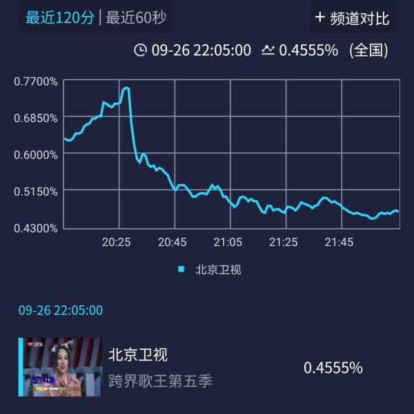 然而,这档《跨界歌王》却已经走入到了鸡肋的状态当中。酷云实时开出的实时收视率数据显示,这一期的《跨界歌王》收视率持续走低。一般的综艺节目,都会在开播之后,有一个收视率的上升区间,最终在晚间十点之后才会呈现走跌的趋势。可当晚,北京卫视《亲爱的你在哪里》开局收视非常不错,但接棒播出的《跨界歌王》却一路下跌。