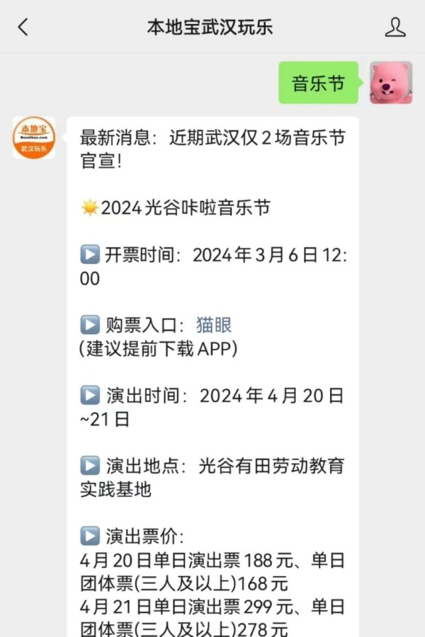 温馨提示:微信搜索公众号【本地宝武汉玩乐】,关注后在对话框回复【音乐节】即可获得武汉各类音乐节活动最新时间、购票入口、音乐节嘉宾阵容、演出时间表,还可拉你进粉丝群。