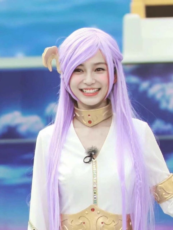 杨颖COS雅典娜,头戴紫发,手拿法杖,笑容超甜,和贾玲气质不同