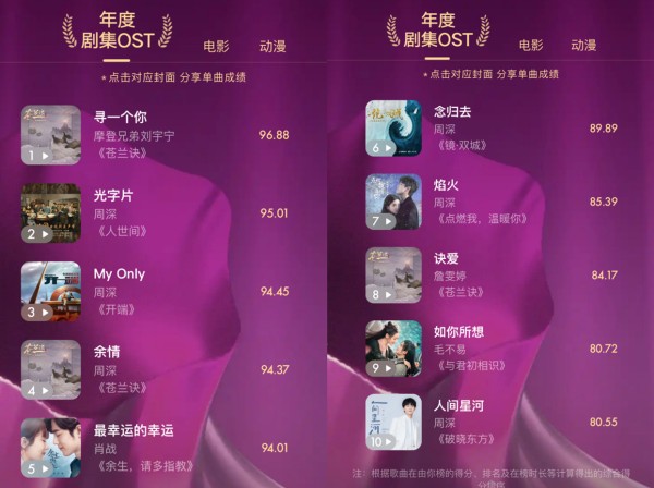 腾讯音乐由你榜年度榜单的部分是统计全网歌曲数据形成,统计并展示了这一年来深受用户喜爱的TOP级作品,该榜单中一半为影视剧原声带。