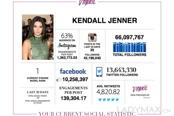 据D’Marie公司数据库的分析,国际超模Kendall Jenner的影响力指数排名第一,Cara Delevingne和Miranda Kerr分别排名第二第三。据D’Marie公司分析的数据显示,这三位模特在社交媒体上发布的一张图片大概能够带来23万美元的收益。