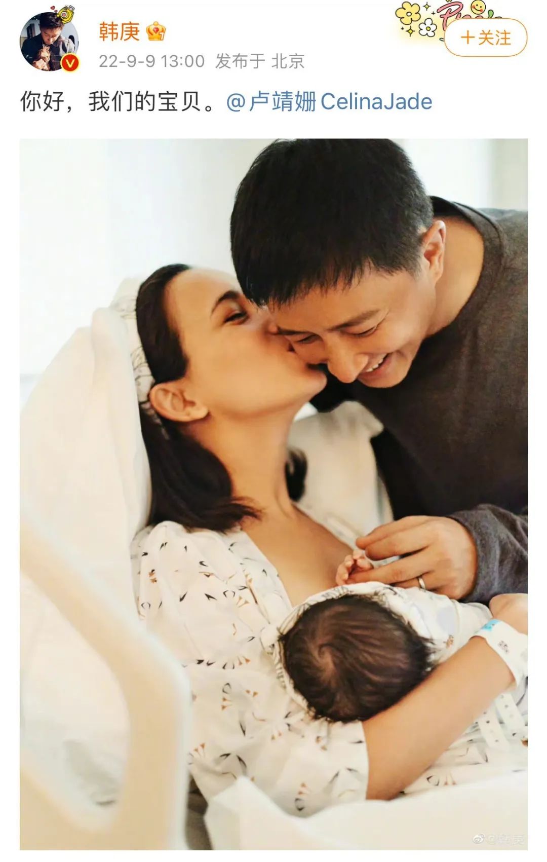 9月9日13:00,韩庚、卢靖姗夫妇同时在微博晒出一家三口合照,以“你好,我们的宝贝”为题,宣布女儿出生喜讯。