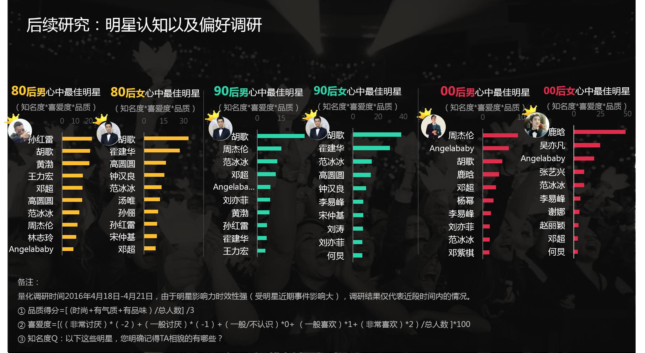 不同明星指向的粉丝群体不同,挑选明星应该尽可能地符合目标群体的口味,通常根据明星在目标群体的知名度和喜爱度来挑选。如以下是不同年龄层(80、90、00后)心中最佳明星的调研数据(统计时间:2016年4月18-21号,非全网明星调研)。