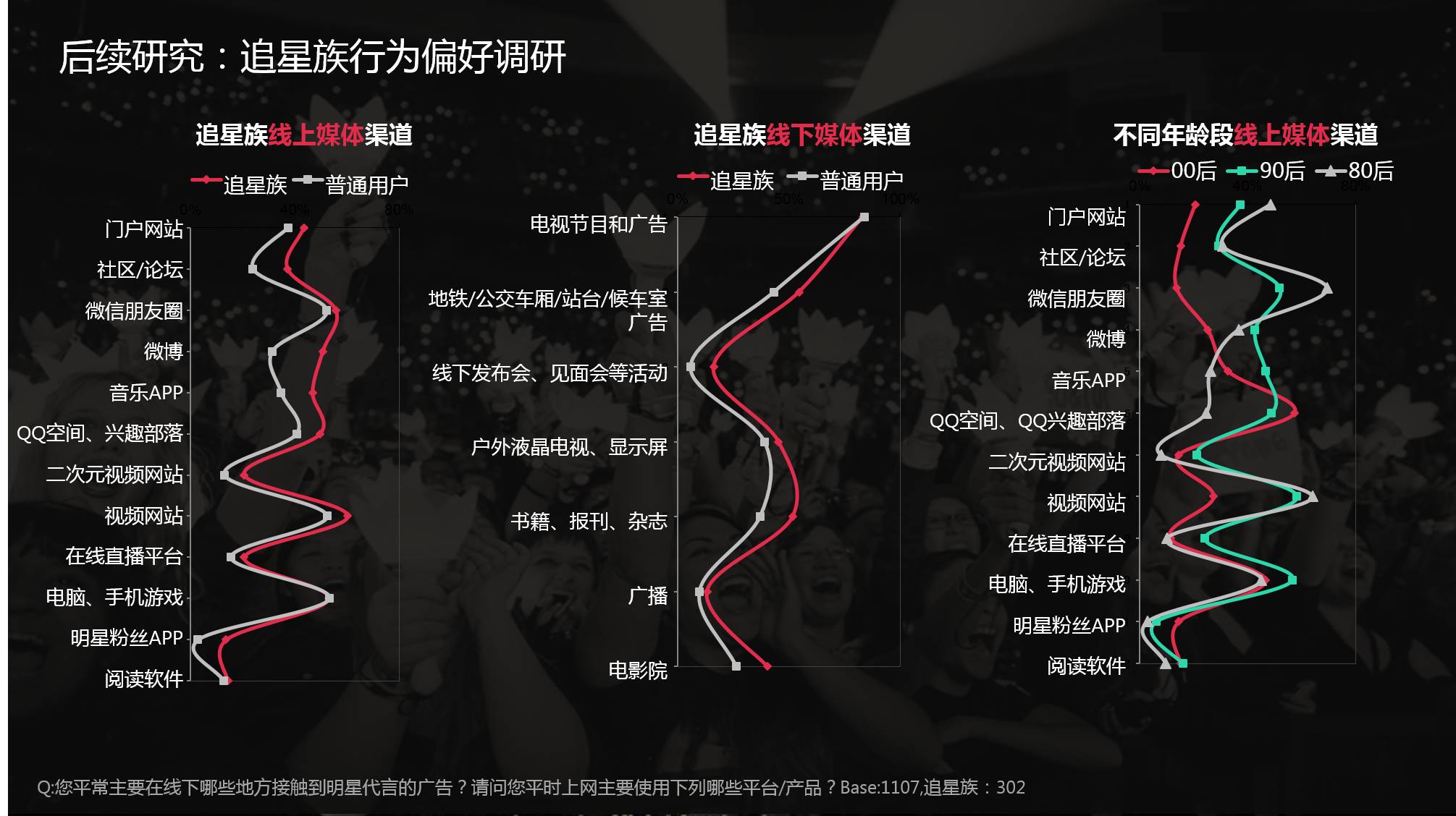 确定了谁是目标群体,需要去了解目标群体在哪里?在看什么?怎么去触达他们?也就是具体的目标粉丝群体的行为偏好研究,以下是追星族、不同年龄层接触媒体渠道的研究,相对普通用户,追星族在线上更多活跃在贴吧论坛、微博、音乐app,在线下更多接触电影院、报刊杂志,粉丝果然是城会玩。年龄层数据表明微信朋友圈果然是大人玩的,00后还是爱玩QQ空间。