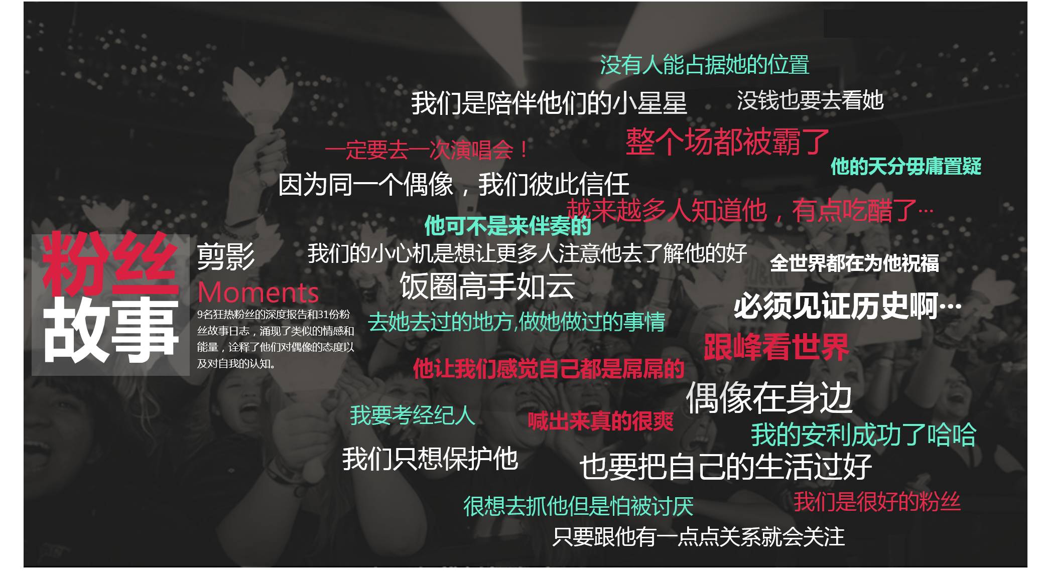 我们通过倾诉欲超强的狂热粉(nao can fen)收集了很多故事(在这里我们发现倾诉本身也是粉丝的一种需求,根本停不下来),故事中这些粉丝无论情感还是行为都有很多相似之处。