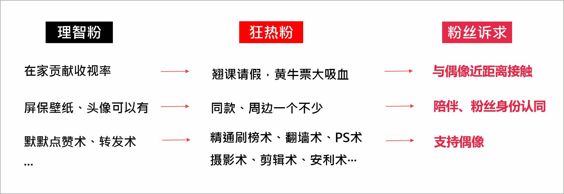 这些狂热粉的追星行为能够包括理智粉、路人粉的所有行为,只是狂热粉的程度更深,愿意付出的成本也更高,但是他们的核心诉求基本一样,例如与偶像近距离接触,支持偶像,获得粉丝身份认同,偶像陪伴等等。