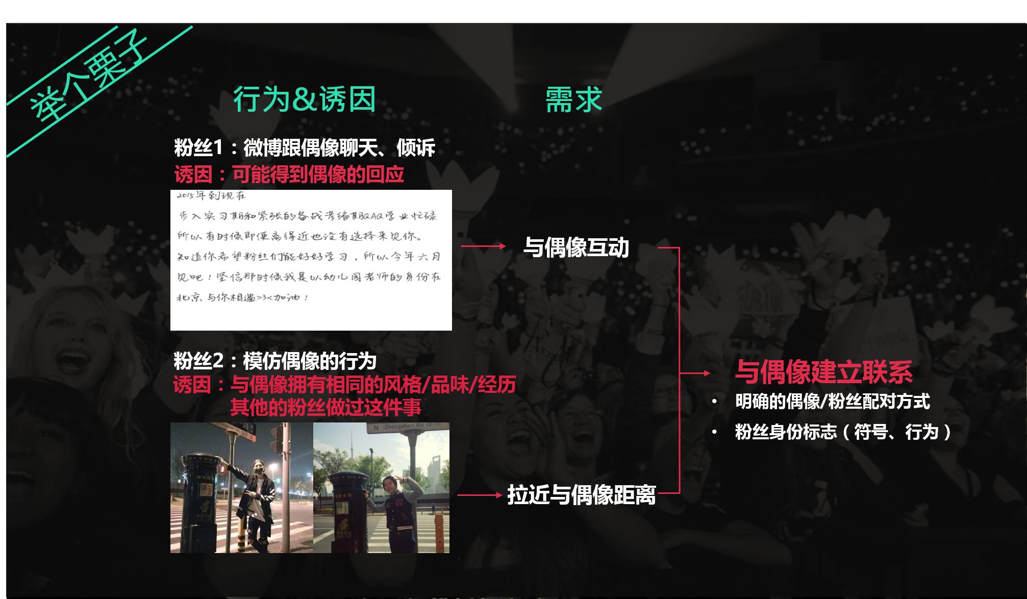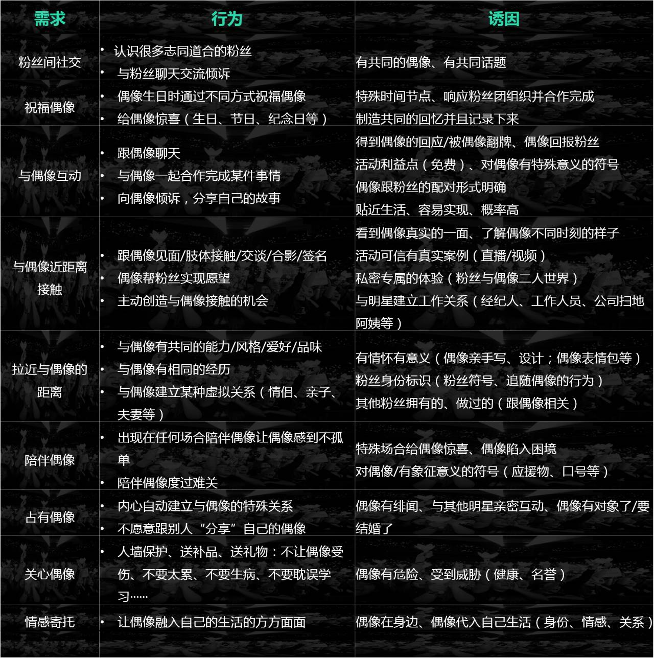 我们从故事里确实发现了很多有意思的东西,但比较零散,所以我们对这些故事进行了解构,分析了具有共性的粉丝行为及其诱因,并归纳粉丝需求,总结如下: