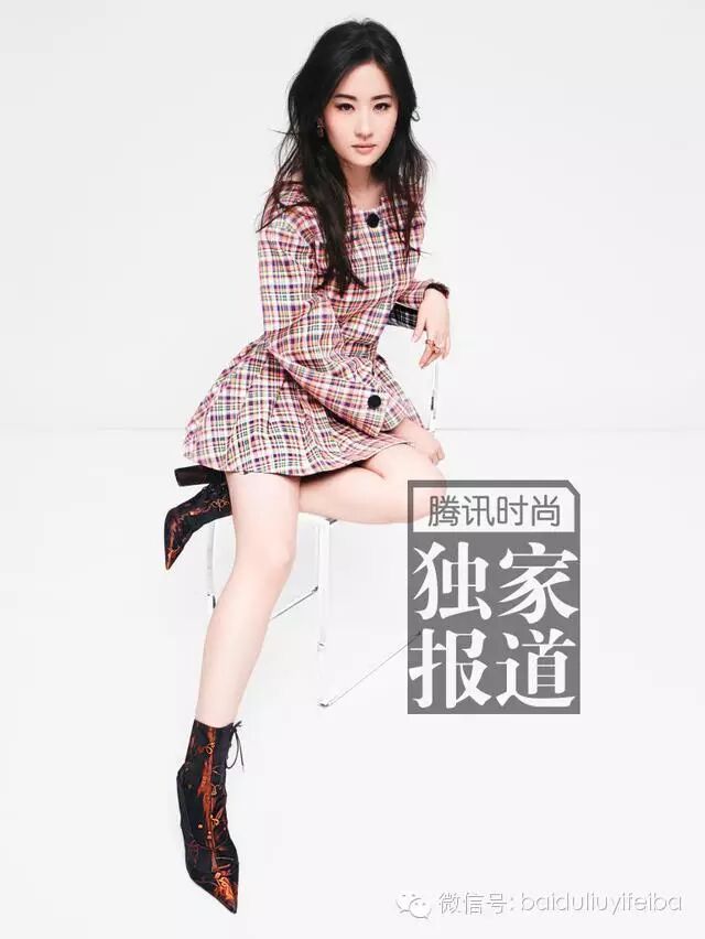 刘亦菲身穿彩色格子的外套坐在椅子上,她静静地看着镜头反而让人更加羡慕她精致的小脸。