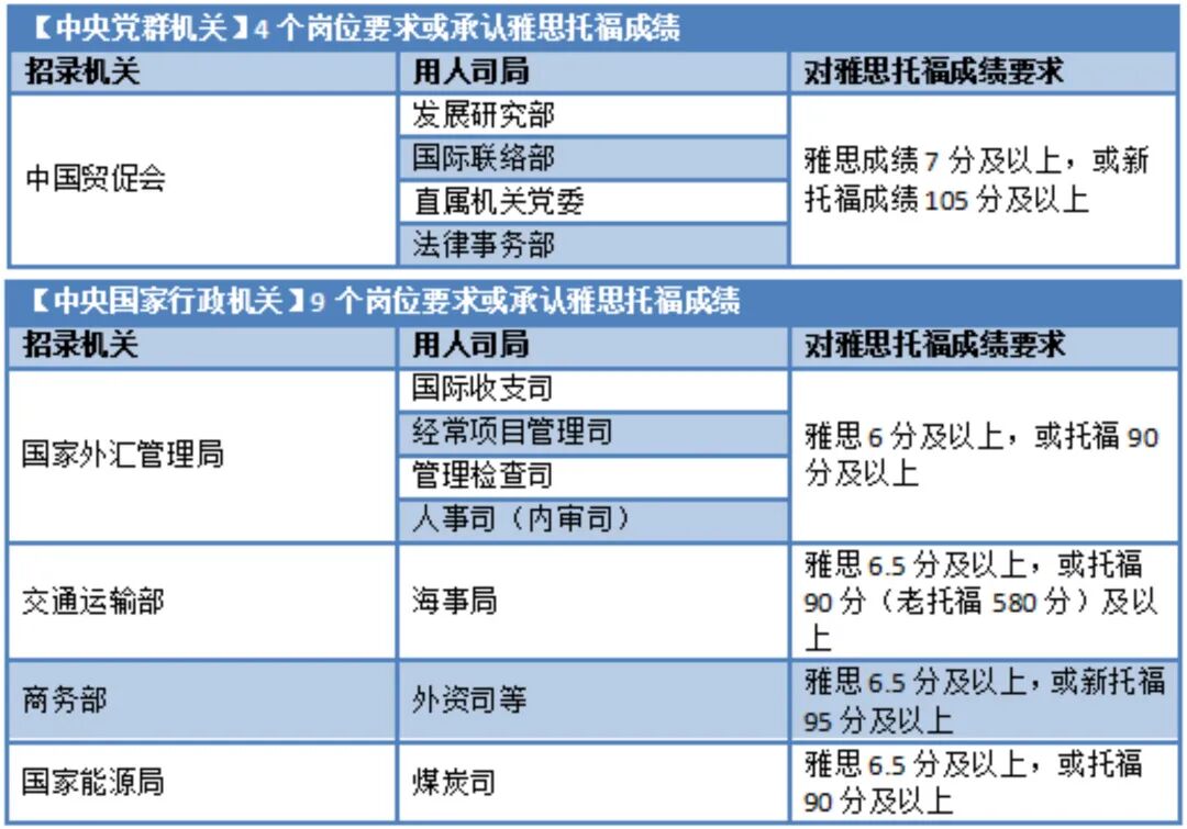 近几年,国务院发布的中央党群机关/行政机关及下属机构的招聘条件表显示:每年有近400个职位明确表示要求6.5-7.5分的雅思成绩或80-105分的托福成绩。