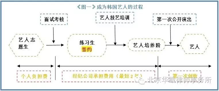 韩国演艺经经纪公司拟培养的艺人如果是未成年,需要经过练习生监护人(父母或者近亲属)的同意才可以进行培训。如《图一》所示,艺人志愿生阶段属于有从事艺人行业的希望,但又并没有接受过演艺经纪公司培训的一些群体。属于通过专业学院或者私人培训,了解到一些演艺技能或者歌唱技能的情况,也存在少数根本没有接受过任何培训的志愿生。在这个阶段所有的费用基本上由志愿生自己负担。志愿生通过演艺经纪公司的面试考核后,需要经历长达2至3年的培训期,由于培训期没有其他娱乐时间,因此非常较为辛苦;除了接受培训外受演艺经纪公司的管理。在经过长达两至三年的培训之后,艺人练习生第一次登台表演后,其身份也就从练习生转化为艺人。