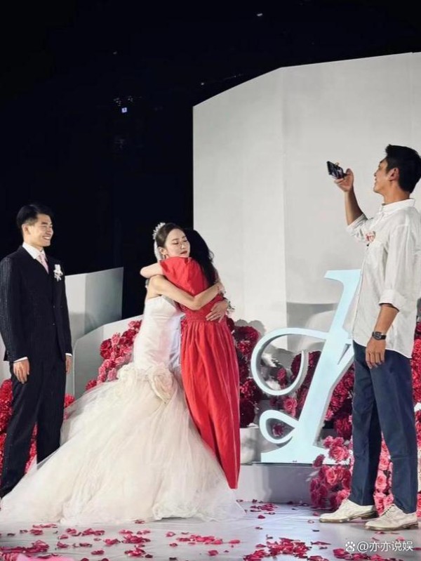 当霍思燕走上台,与新娘紧紧相拥,那份超越岁月的情谊在她们的笑容中流淌,杜江在一旁默默记录下这一切,新郎在不远处,也是满眼笑意,场面温馨至极。霍思燕与新娘间的深厚友谊,通过那些不经意间的小动作,比如轻轻勾住对方颈项的那只手,展现得淋漓尽致。而她那无需粉饰的自然美,在这个特殊的日子里,成为了另一道亮丽风景线。