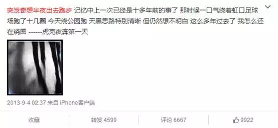 “突发奇想半夜出去跑步,记忆中上一次已经是十多年前的事了,那时候一口气绕着虹口足球场跑了十几圈,今天绕公园跑,天黑思路特别清晰,但仍然想不明白,这么多年过去了,我怎么还在绕圈。”