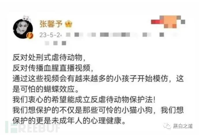 5月30日,有博主爆料称因张馨予为反虐待动物发声,已经被不法分子盯上并扬言要“开盒”张馨予(非法获取个人信息)。