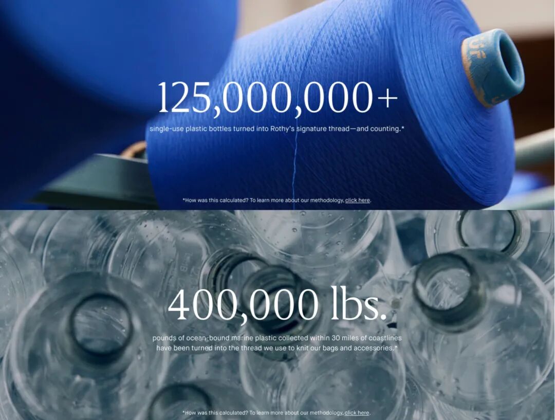 当在售卖鞋子时,Rothy's会告诉你,你买到不只是一双鞋,还有环保。为了更直观地向消费者传递环保理念,Rothy's会经常在官网上更新已回收塑料瓶的数量。他们公布的一组数据显示,截至2022年3月,Rothy's为制造1188184公斤纱线而收集的瓶子总数可能已超1.25亿个,总计回收超过400000磅的海洋塑料。