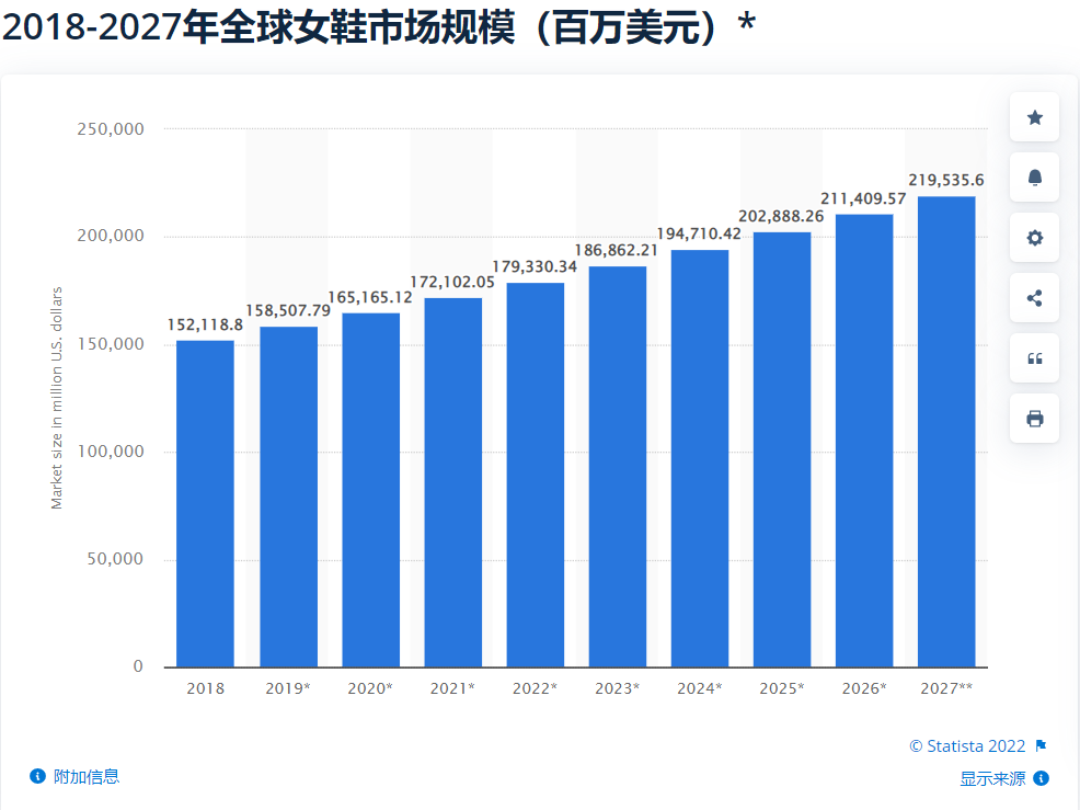 Statista发布的“2018-2027年全球女鞋市场规模”统计数据显示,2018年全球女鞋市场规模约为1521亿美元,预计到2027年将达到约2200亿美元。