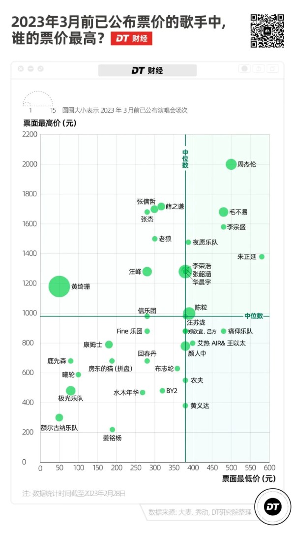 DT财经统计了2023年3月前已知的演唱会票价和场次,发现三点: