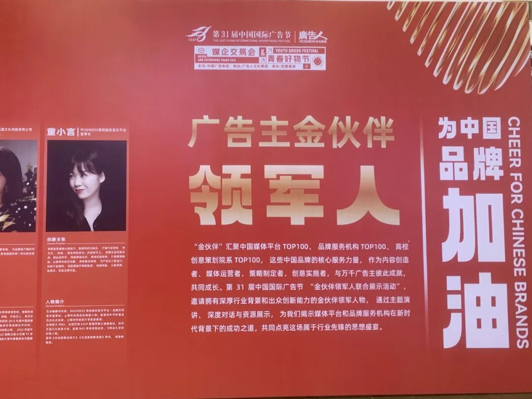 为中国品牌加油!第 31 届中国国际广告节 “金伙伴领军人物联合展示活动”,邀请拥有深厚行业背景和出众创新能力的金伙伴领军人物,共同点亮这场属于行业先锋的思想盛宴。MUSINESS商用版权音乐平台董事长 童小言女士,有幸获称“广告主金伙伴领军人物”以及“2024当代杰出广告人”。