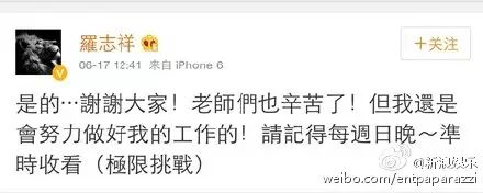【罗志祥承认恋情了?日前,罗志祥被拍到和绯闻女友周扬青同住酒店,并连续两宿在一个房间过夜。而早前两人曾被拍到同游日本,戴情侣表等。刚刚,罗志祥疑似承认这段恋情,发微博称:“是的⋯谢谢大家!老师们也辛苦了!”让不少粉丝猜测其承认恋情。】