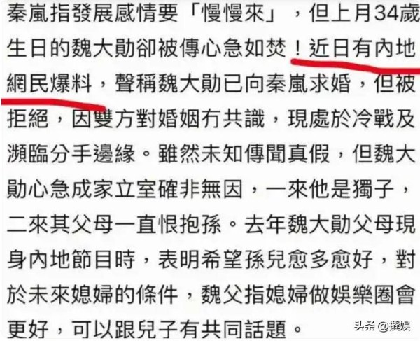 可是到了5月,港媒却突然爆料,魏大勋求婚遭拒,原因是秦岚不愿结婚生子,而魏家希望独子尽早成家,两人由此陷入冷战。