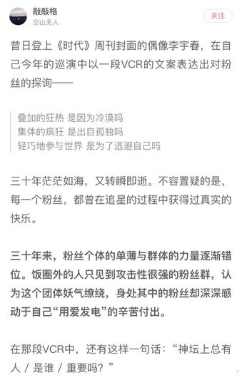 “三十年来,粉丝个体的单薄与群体的力量逐渐错位。如今饭圈外的人只见攻击性很强的粉丝群,认为这个团体妖气缭绕;但身处其中的粉丝却在为自己‘用爱发电”的辛苦付出而深深感动。”