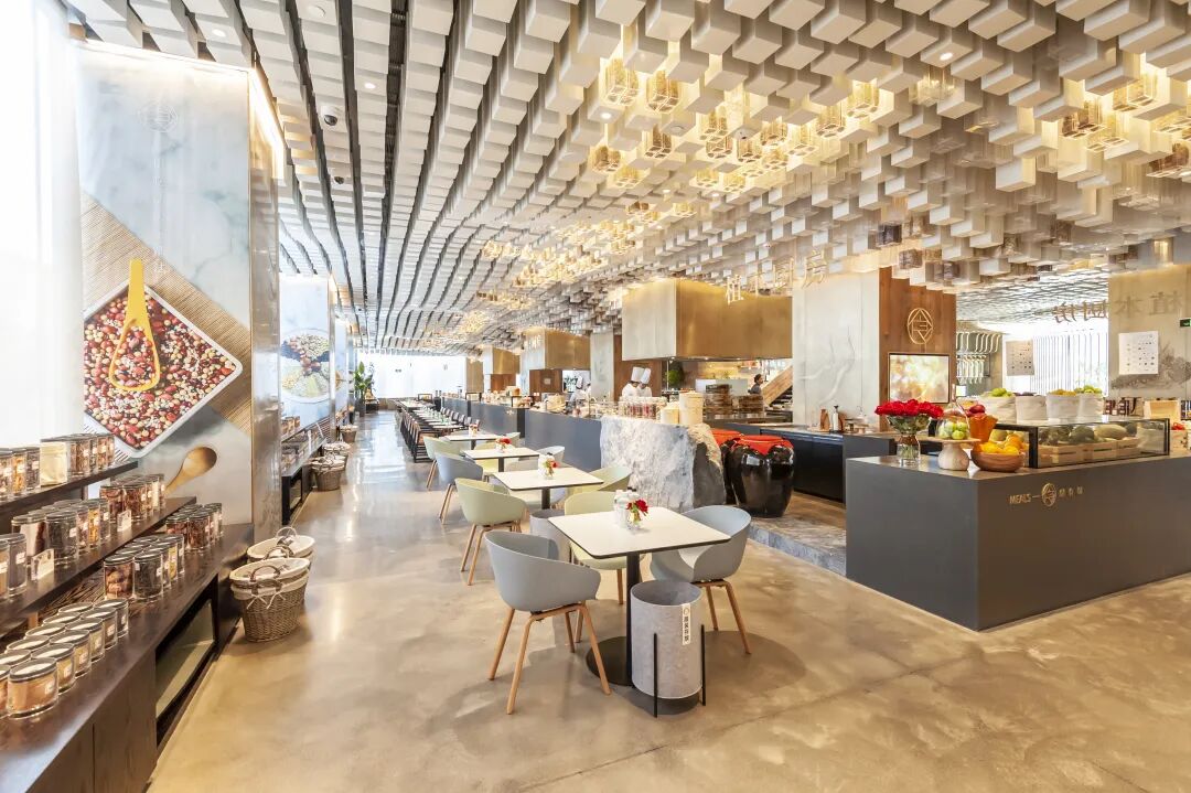 以北京市大兴区知嘛健康零号店为例,该门店占地约 4700平,分为上下3层。内容上,以“饮、食、象、养、颜、动、能、医”为主题设置。空间设计上,使用实木和黄铜在店内大面积铺陈、冲撞,运用榫卯结构纵横连接和颇具质感的金属圆管,将新中式现代时尚又简约古朴的风格,呈现在消费者面前。