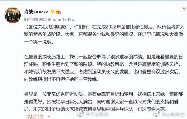 13日下午五点,在没有任何征兆的情况下,中国乒乓球队女乒教练肖战突然通过社交媒体宣布,自己和徒弟王曼昱终止了师徒关系。在这份声明中,肖战写道:在完成2022年全部比赛任务后,队伍也将进入新的储备备战阶段。现在说明下我和王曼昱的情况,在执教互相配合中,两人一起配合取得了不少成绩。成熟了的王曼昱职业生涯到了新阶段。我的高强度的训练风格不太适应她的未来。为了王曼昱今后的发展,经过双方商议后,主动辞职。