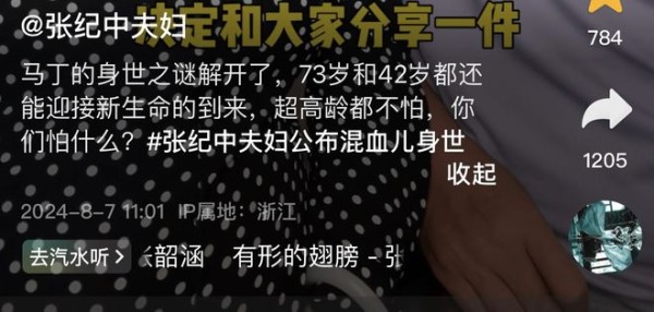 张纪中也是直接在社交平台上表示,别人都问马丁是谁的孩子,“是夫人的孩子”,这句话听起来倒是有些浪漫。