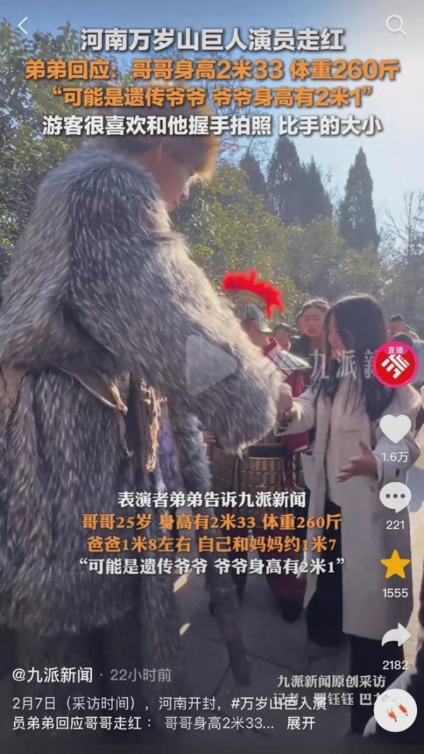 河南万岁山景区“2米33巨人”演员引关注;经纪人回应各方关切:没有巨人症揭秘!万岁山2米33巨人回应是否患巨人症