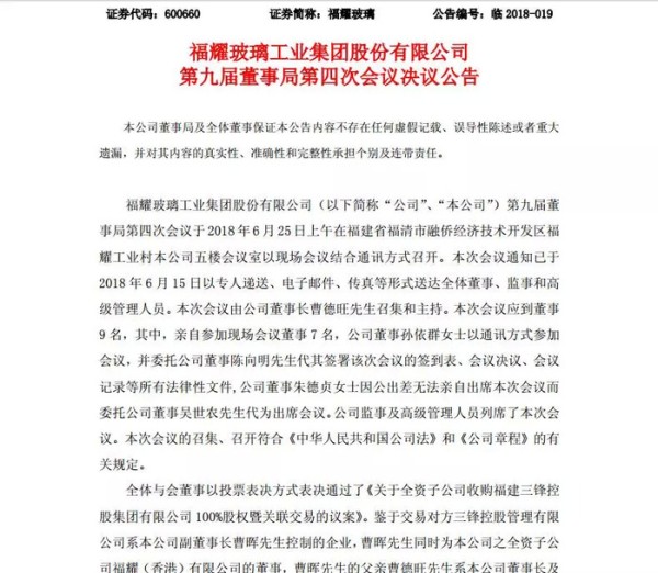 福耀玻璃发布全资子公司收购“福建三锋”董事会公告
