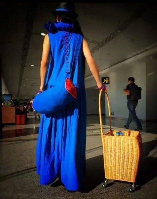封面新闻讯(记者 伍翩翩)杨丽萍日前晒一组机场照,照片中她身穿蓝色长裙墨镜遮面,头戴黑色小帽十分有范。不过这都比不上她挎的枕头包与手里拿的菜篮子行李箱,简直太吸睛了。而网友们也纷纷点赞:只有她的气质hlod得住这样的时尚!