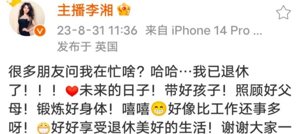 一些“玩票”性质的明星被动筛选掉,因为他们缺乏基本的专业素养,或者不了解电商运营的逻辑,很容易就被淘汰掉。另外,对于相当一部分艺人来说,他们面临的难题是“风险比”。目前最主流的模式是经纪公司和MCN合作,这样的模式带来了高收益,但同时也伴随着极高的“翻车率”,近期“翻车”的情况几乎成了家常便饭。如果事态严重,还会面临舆情风险、形象受损,甚至结束自己的职业生涯。其次,明星直播带货已经进入第三年,风光早已大不如前。一方面是各家平台抢人大战接近尾声,失去扶持的明星的直播数据开始断崖式下跌,另一方面是大量明星出于主观或是客观原因,淡出或撤离。李湘就是一个很有代表性的例子。2019年,她被称为“第一个吃螃蟹的明星”,从而顺理成章坐上“带货一姐”的位子。然而到了2023年8月31日,她在个人微博上宣布“我已退休”,这似乎预示着明星带货时代的终结。