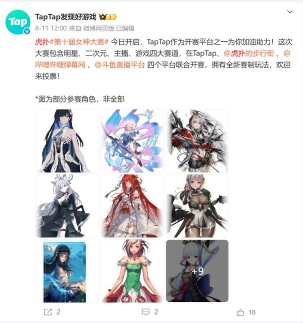 到了今年,虎扑引入了斗鱼、b站和TapTap等三个新的投票渠道,又把主播、二次元等女神候选者放到了一个池子里,目的就是为了让大赛充满变数和看点,同时让论坛的影响力触达二次元群体。
