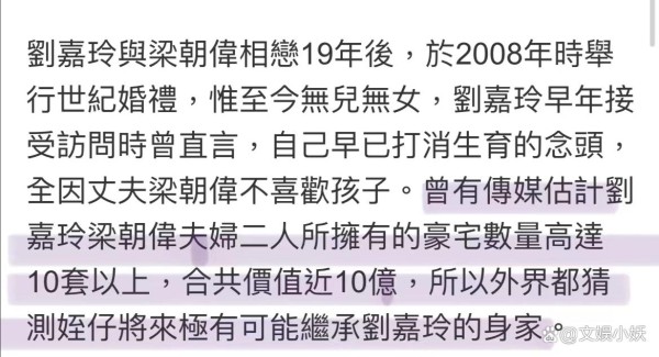 刘嘉玲与梁朝伟在一起将近34年了,但由于梁朝伟不想要小孩,两人至今没有孩子。因此,刘嘉玲将侄子视如己出,媒体猜测侄子极有可能继承刘嘉玲与梁朝伟近10亿的身家。