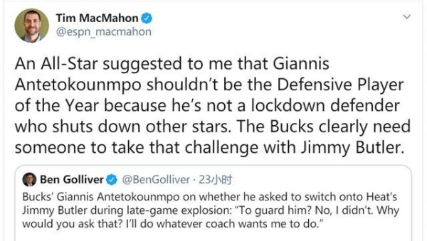 雄鹿在次轮G1不敌热火,让字母哥也招致了不少非议,而他赛后称自己不会换防吉米-巴特勒,更将自己推到风口浪尖。今天,据知名记者Tim MacMahon透露,有一位全明星球员对他说,字母哥不是一位能锁死对手球星的防守者,不该当选最佳防守球员。