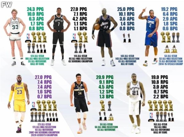 4冠4MVP,4次FMVP,17次全明星,17次最佳阵容,6次最佳防守阵容,1次得分王,1次助攻王,1次最佳新秀