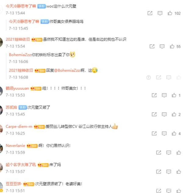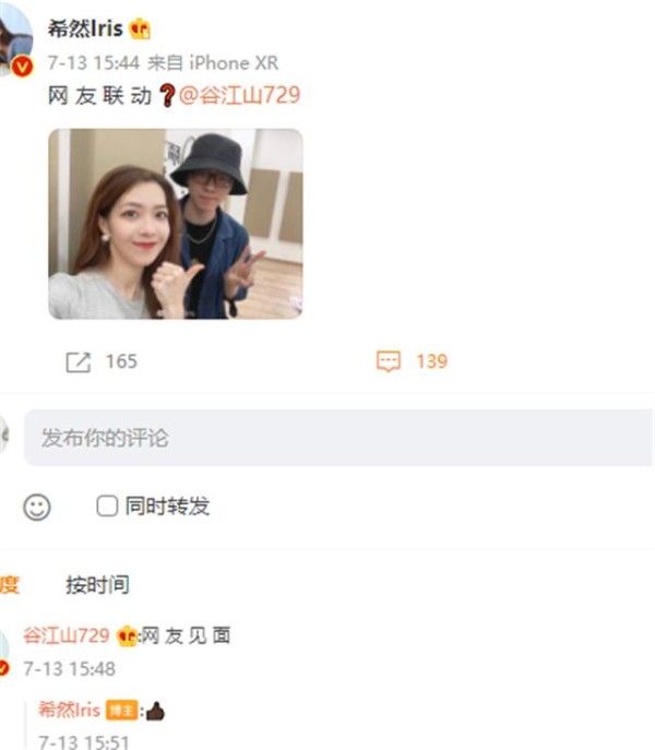 谷江山的声音好听,没想到他跟希然也是朋友。这张照片里,希然大拇指指着谷江山,对方则伸出剪刀手。两人看起来十分默契,希然说这是“网友联动”,或许他们网上交流许久,如今终于在现实中见面。因为谷江山的留言是“网友见面”。