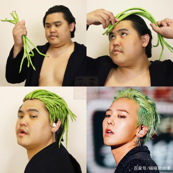 说起韩国男明星权志龙,那也曾是在前几年名噪一时的大明星噻!清俊的长相惹得不少女粉丝尖叫,这大概就是追星的快乐源泉之一吧!于是,小胖哥也"爱美之心人皆有之"了一把,还专门挑了一张发色奇怪的照片来凸显自己神奇的脑洞。你猜小胖哥拿权志龙小哥哥的绿色头发怎么办?绿色又柔顺的头发,用绿色长豆角来cos最合适不过了!