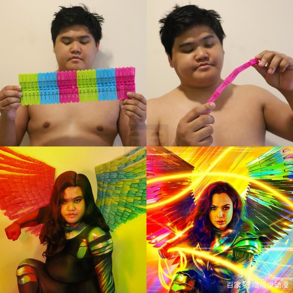 《神奇女侠》作为由美国华纳兄弟公司制作的奇幻动作片,自然因为其有保障的剧情和演员而备受影迷的喜爱。小胖哥应该也很喜欢欧美明星吧?毕竟他们的外形条件真实比亚洲人跟立体。所以小胖哥最后又选择cos了一下《神奇女侠》的出演者盖尔·加朵。外形看一看也就过去了,只不过这用彩色夹子组成的翅膀也肉眼可见小胖哥此次cos的不容易啊!
