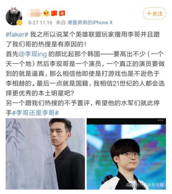 前段时间因李现出演有关电竞影视剧而人气火爆,甚至被众多女网友封为“国民老公”,其热度在娱乐圈内迅速蹿升,在总多偶像人气排行榜中甚至超过新一代流量明星蔡徐坤。而这样一位饰演电竞明星的艺人的粉丝,却与现实中真正的电竞明星LOL知名职业选手Faker的粉丝发生了冲突。