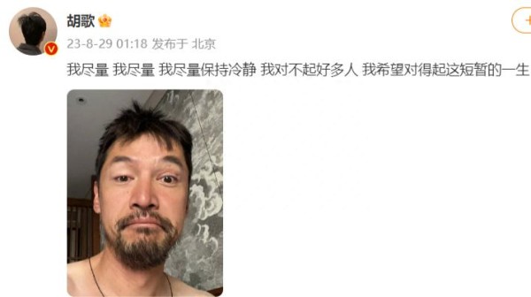胡歌删除负面动态,晒自拍挽回形象,向多人道歉疑患抑郁引担忧