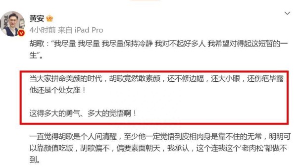 而在这个多元的声音中,主持人黄安则表示对胡歌的行为感到欣赏。他认为在这个以外貌为主的时代,胡歌竟然敢于如此大胆地展示自己的原始状态,这种勇气和觉悟实在难能可贵。